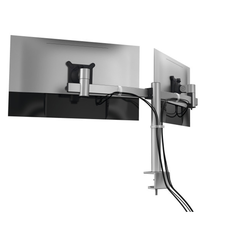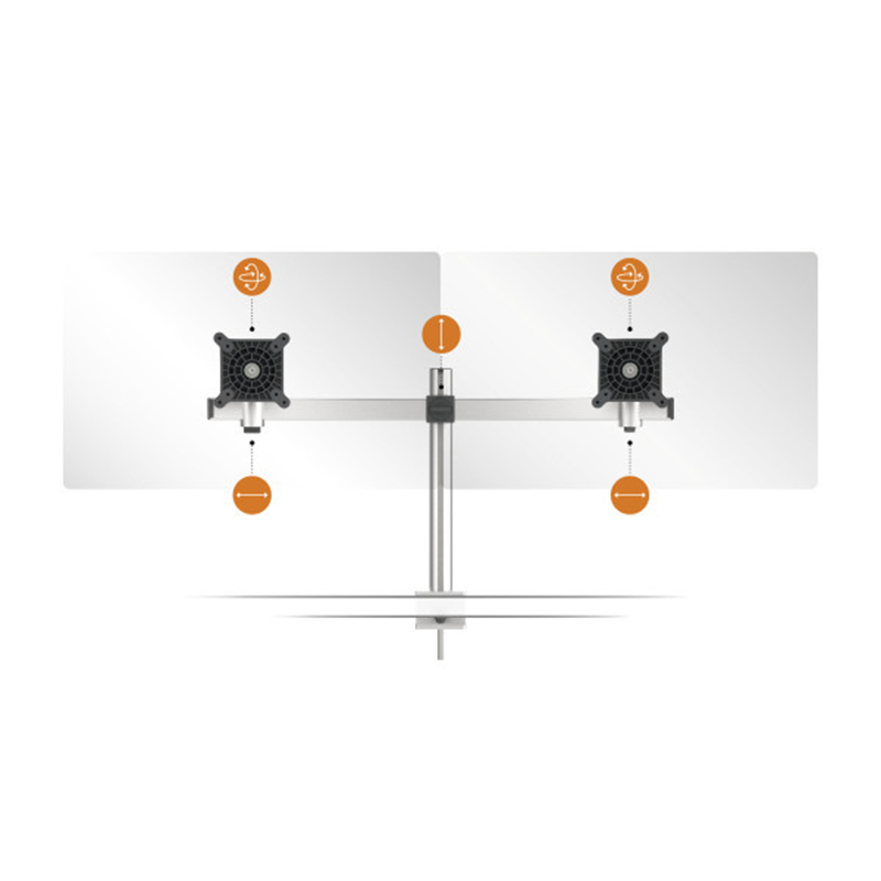 • Держатель состоит из стойки, перекладины и 2 подвижных вращающихся креплений для мониторов VESA