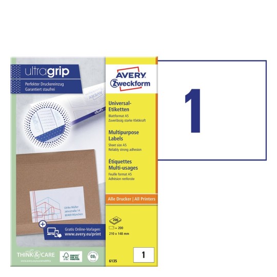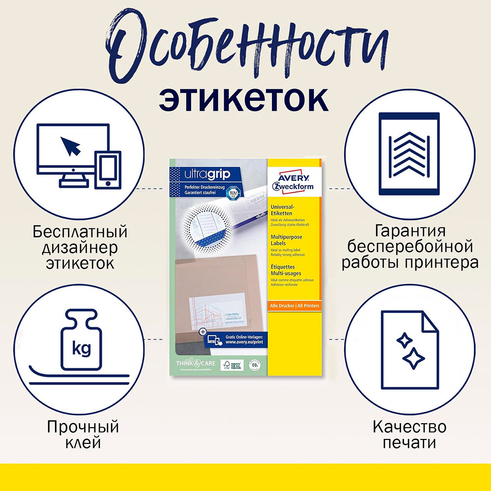 Белые многоцелевые этикетки идеально подходят для маркировки документов. Формат А5 удобно использовать при малых объемах печати. Размер 210 х 148. Гарантия бесперебойной печати принтера. Лучший клей: этикетки надежно приклеиваются на бумагу, картон, стекло и пластик. Идеальное решение для маркировки конвертов, упаковки, папок, скоросшивателей и прозрачных файлов. Вы можете быстро создать и распечатать этикетку с помощью бесплатного ПО на нашем сайте и шаблонов Avery Zweckform. Подходят для печати на всех черно-белых и цветных лазерных и струйных принтерах. Благодаря бесплатному программному обеспечению и шаблонам Avery Zweckform Вам совсем не нужно тратить время на дизайн и печать этикеток и самоклеящейся бумаги А5. Мы предлагаем большой выбор дизайнов и готовых шаблонов для печати. Просто введите номер артикула с упаковки, выберите нужный дизайн, создайте свою этикетку и распечатайте! Готово!