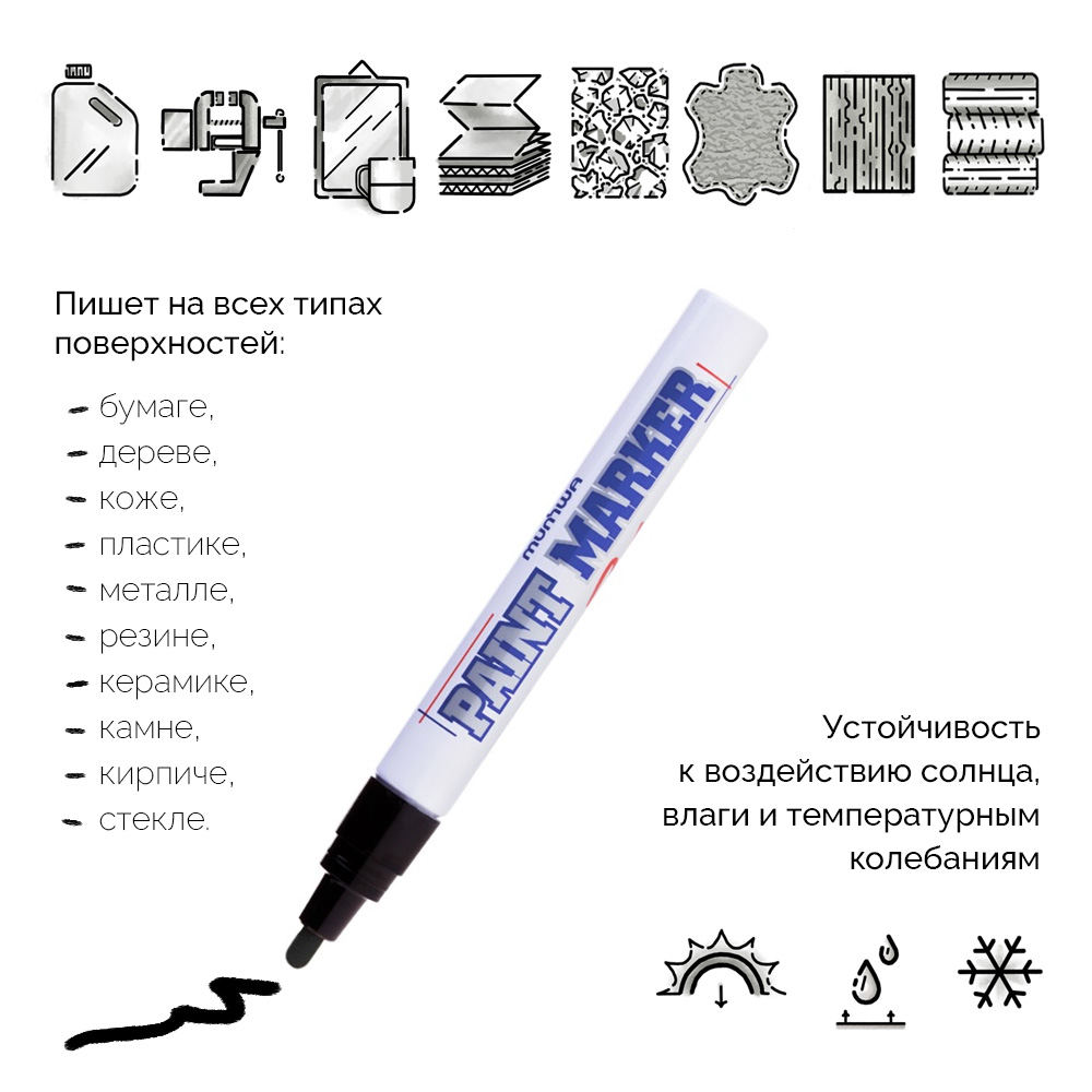 Маркер-краска MunHwa (Мунхва) PM – профессиональный лаковый маркер на нитрооснове. В наличии множество оттенков на выбор. Чернила имеют насыщенный цвет и обеспечивают качественный результат. Можно использоваться на горячей, ржавой, мокрой, грязной, шершавой, пористой, промасленной и жирной поверхностях. Маркерами Munhwa PM пишут на металле, пластике (ПВХ), резине (шина), асфальте, бетоне, камне, кирпиче, дереве, пластике, стекле, плитке, керамике и коже.