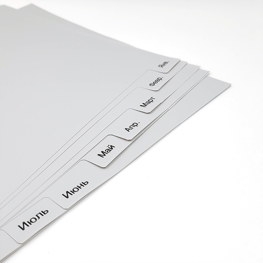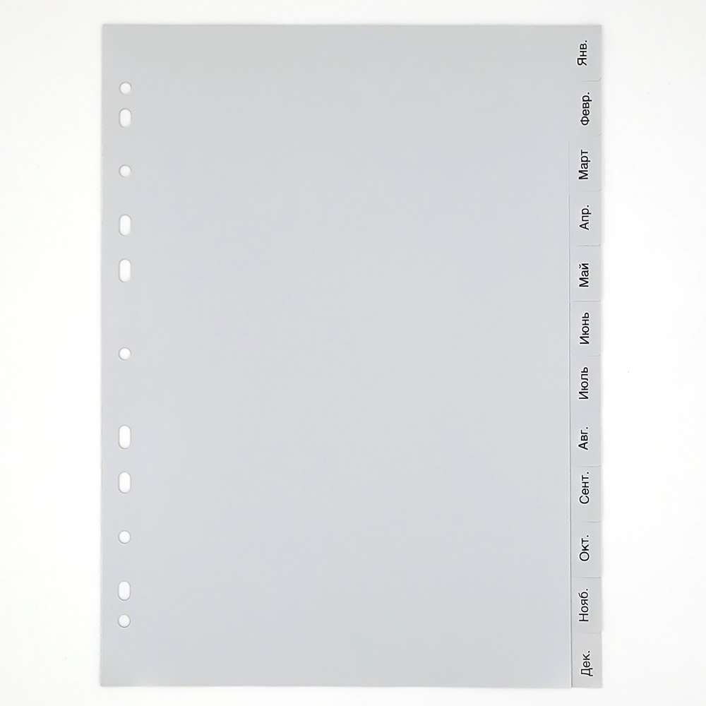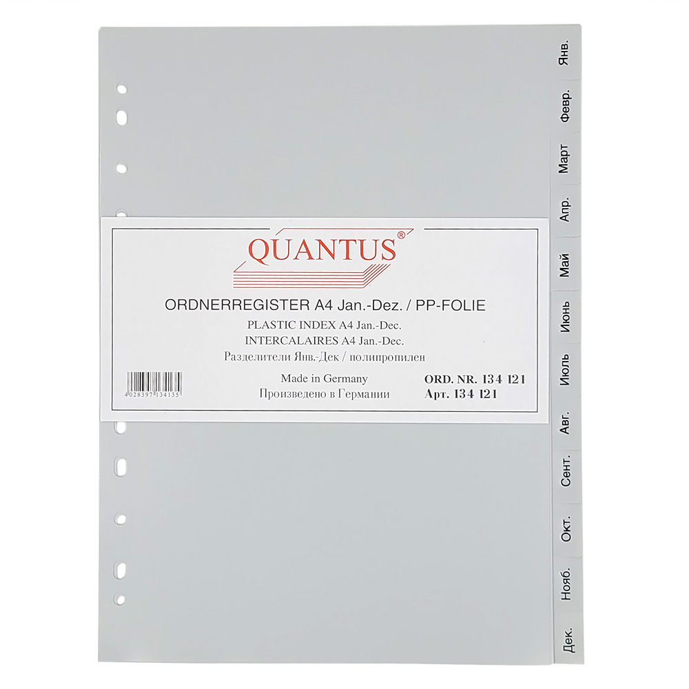 Цветные серые разделители листов с табуляторами от немецкого производителя Quantus из полипропилена. Подходит для сортировки документов по месяцам за год.