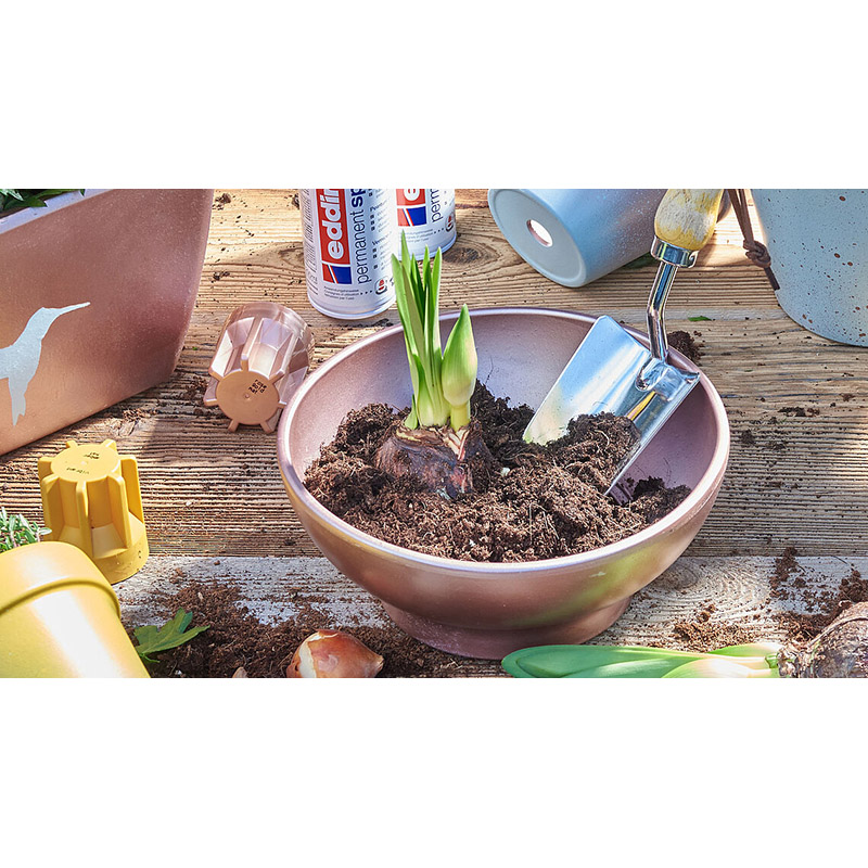 - Предмет, который вы намереваетесь покрасить, должен быть сухим, чистым и не иметь следов жира или ржавчины. С помощью скребка или наждачной бумаги удалите с поверхности любые крупные неровности. Воспользуйтесь грунтовкой для пластмассовых и полистироловых поверхностей edding либо универсальной грунтовкой edding (при этом соблюдайте рекомендованное время сушки)